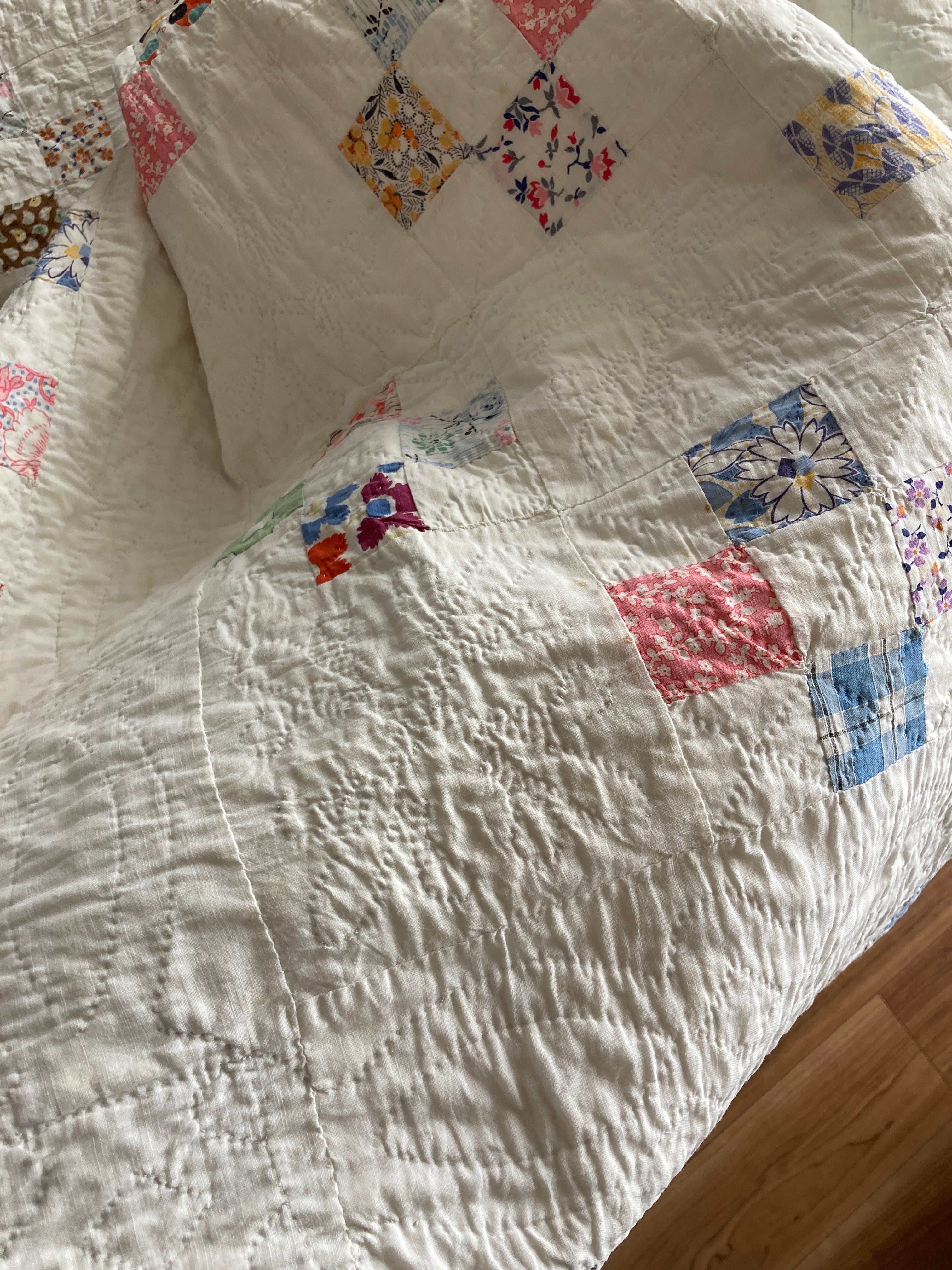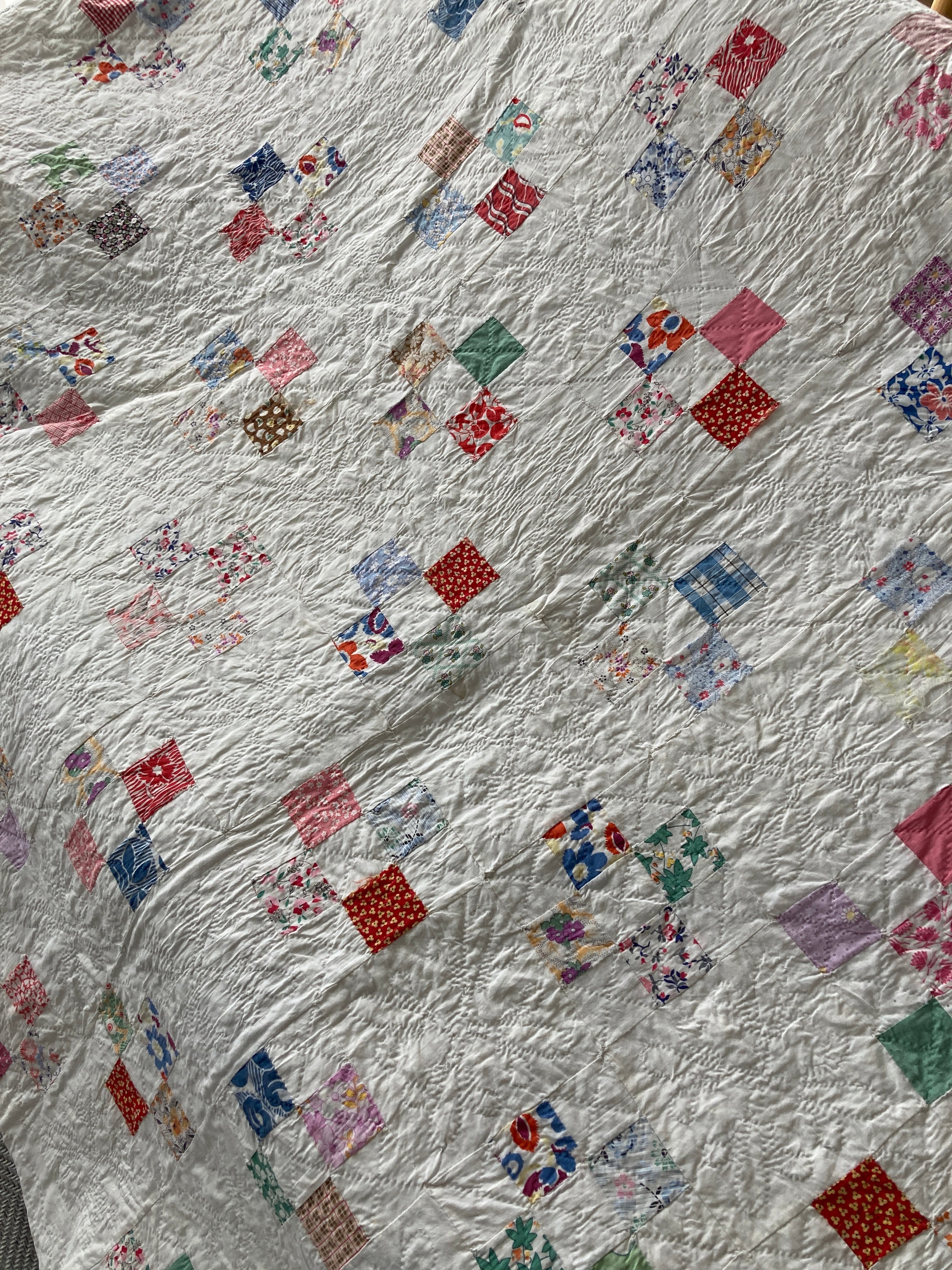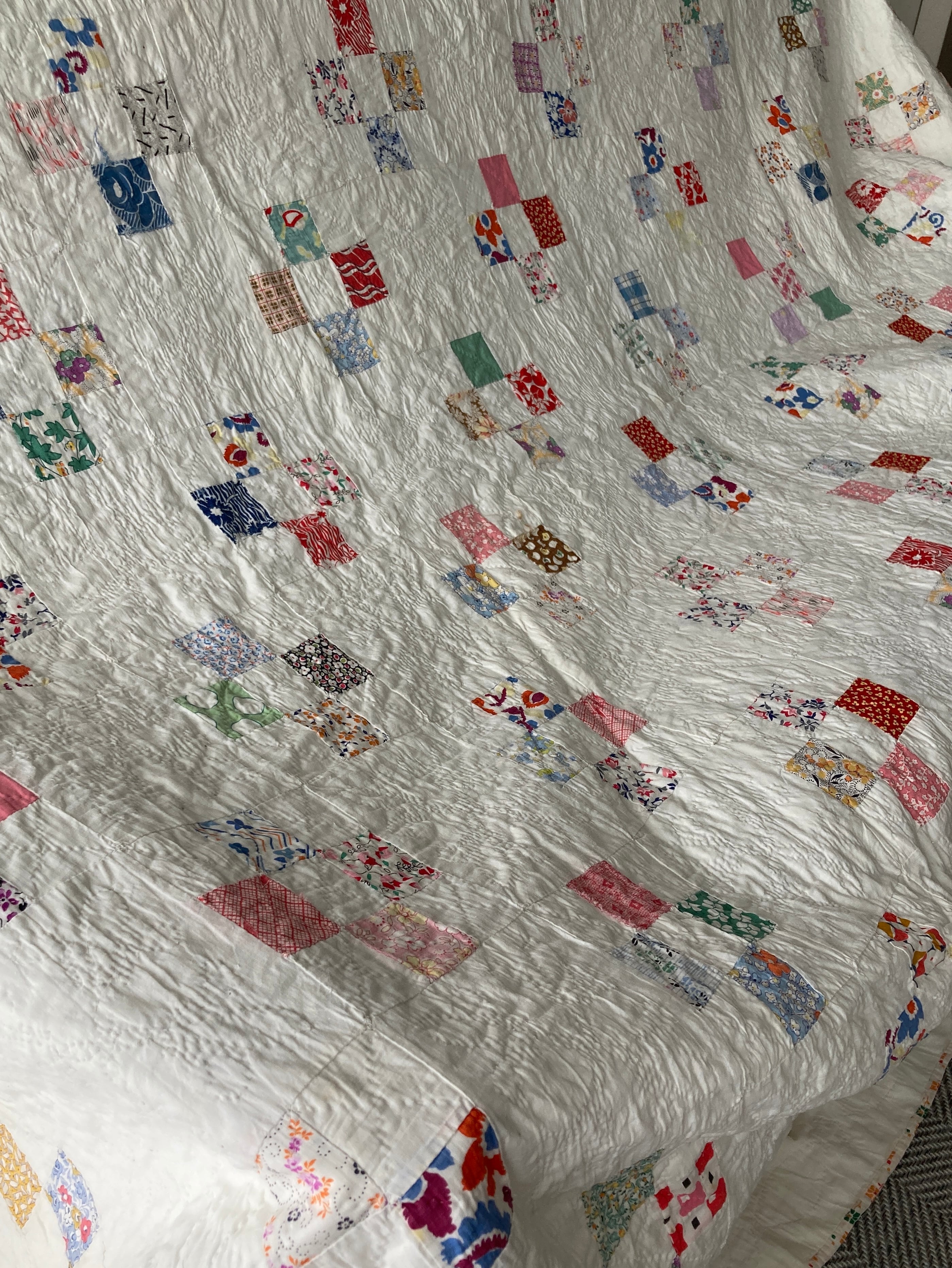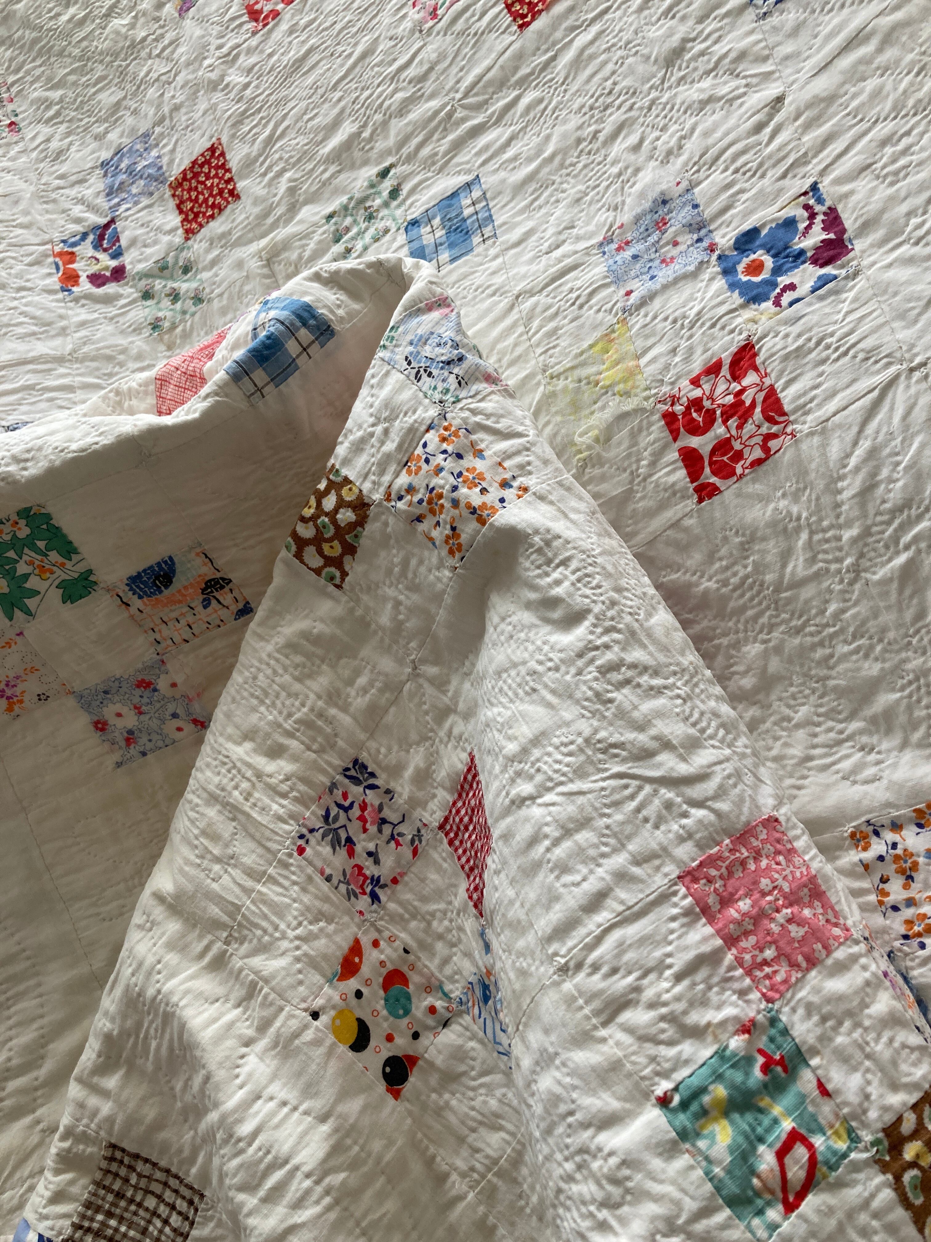 白い背景から浮かび上がる可愛らしさが魅力的な、ナインパッチキルトです。