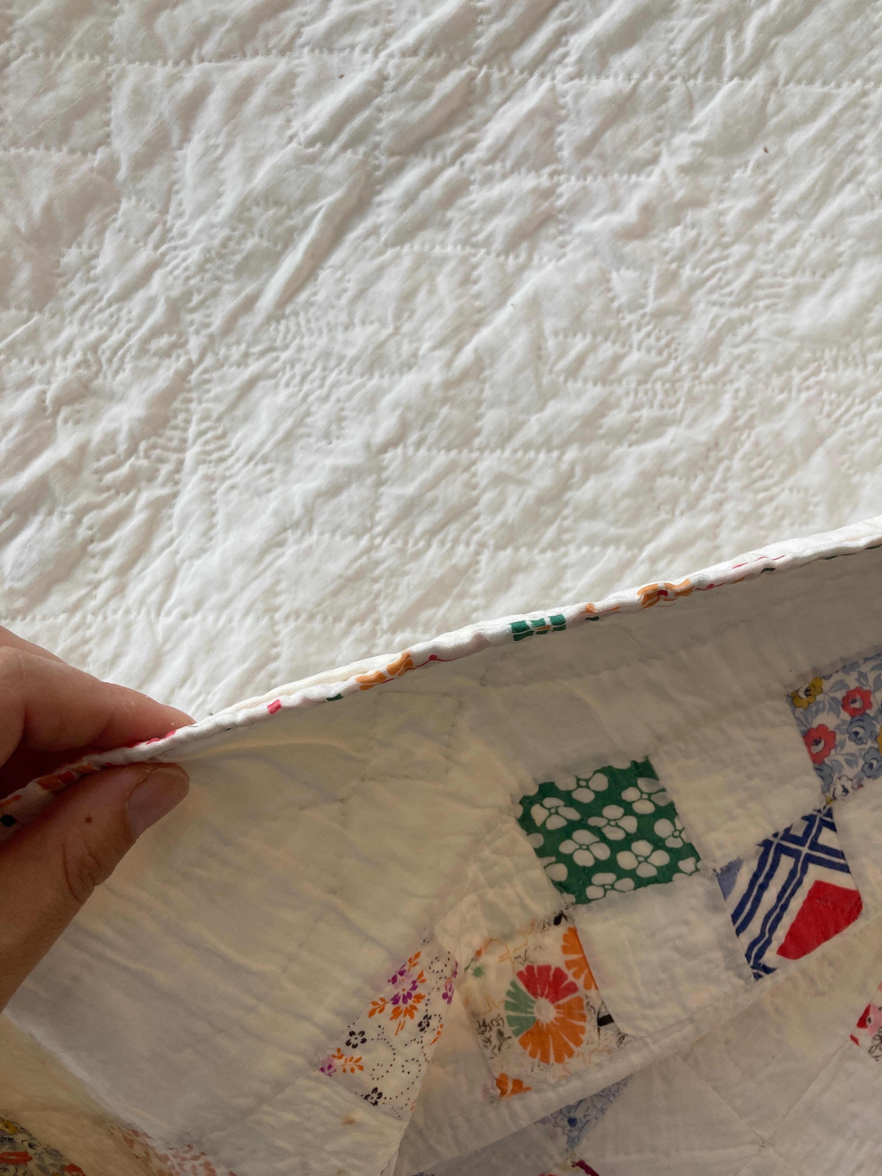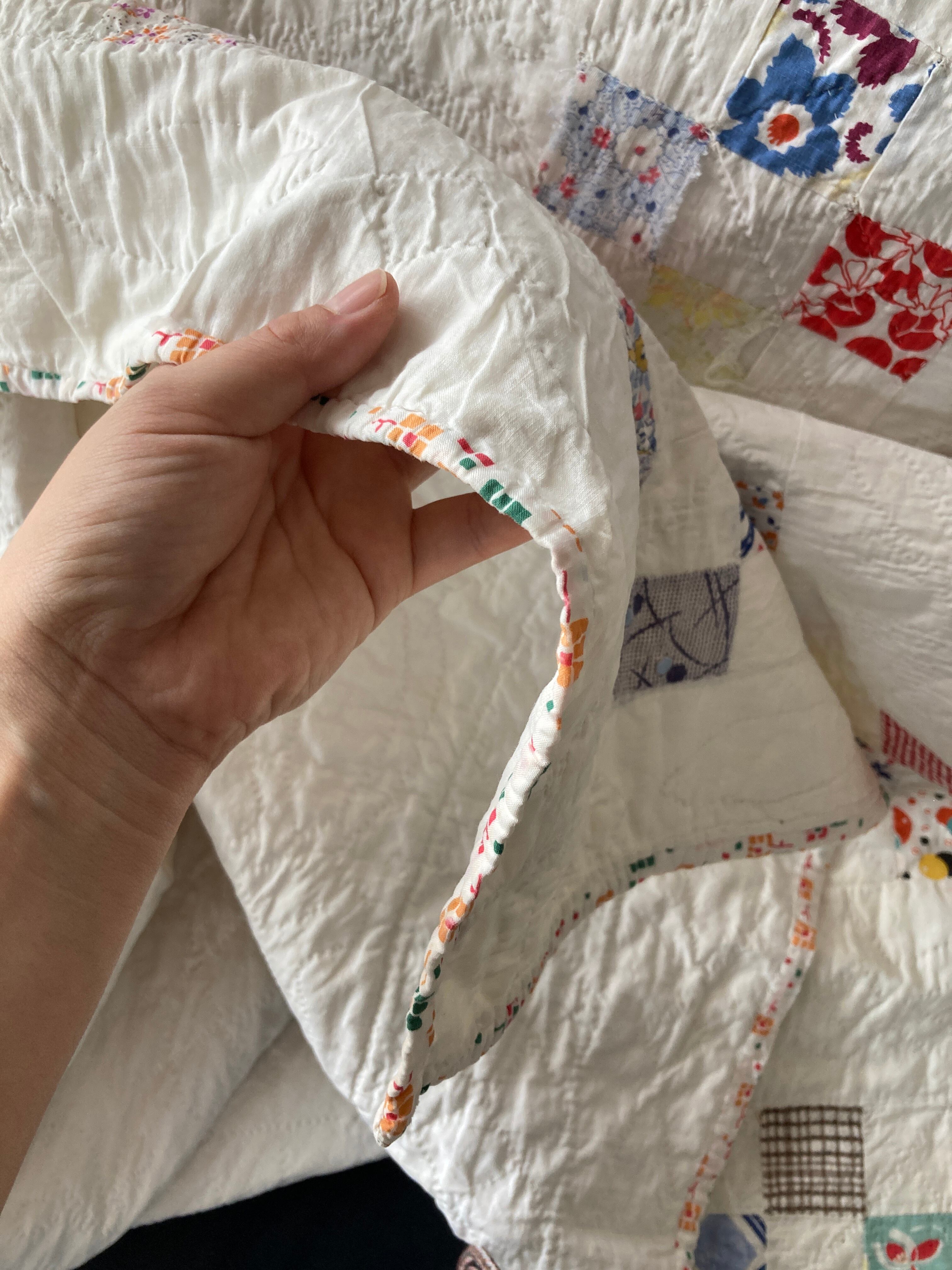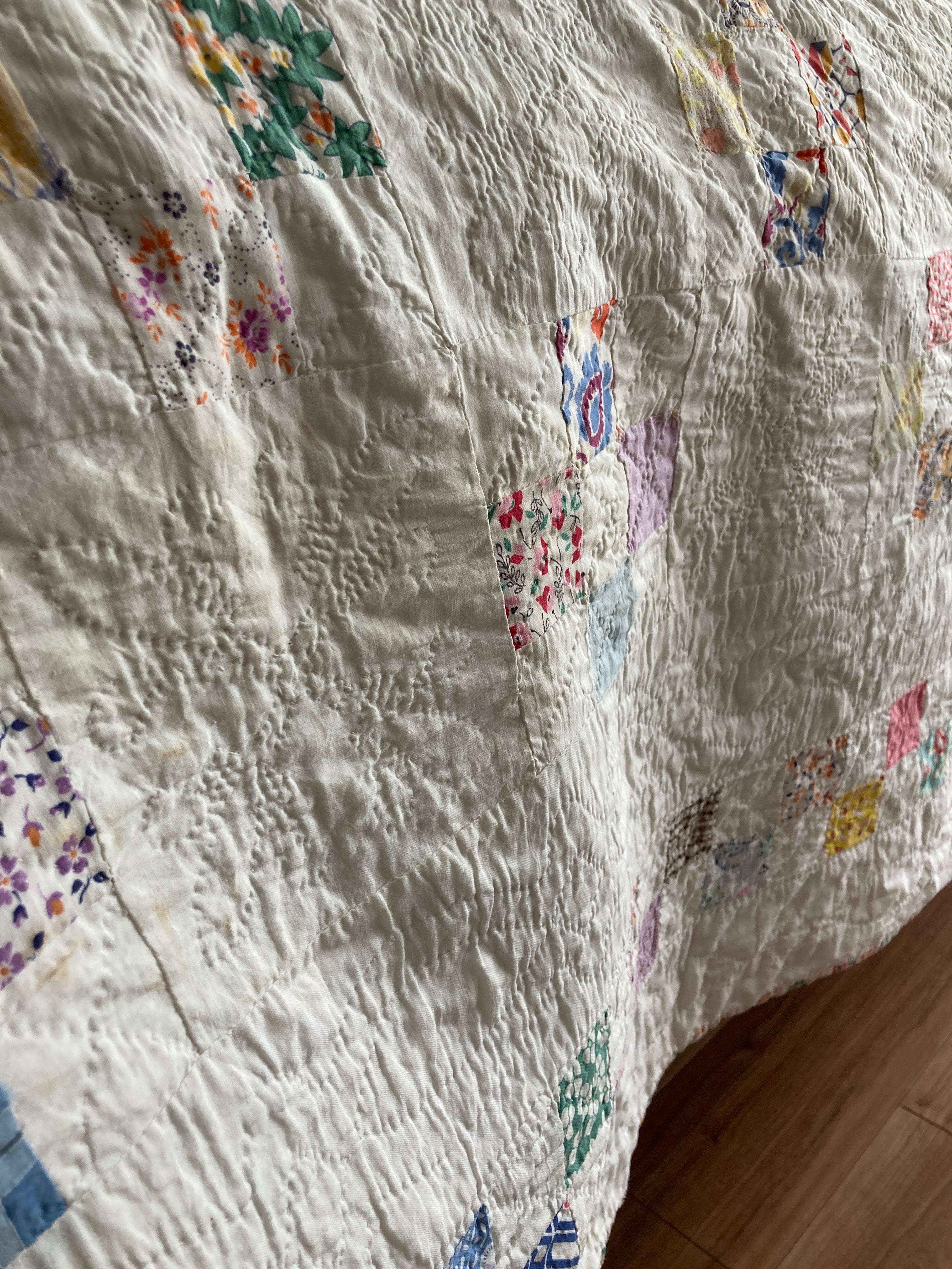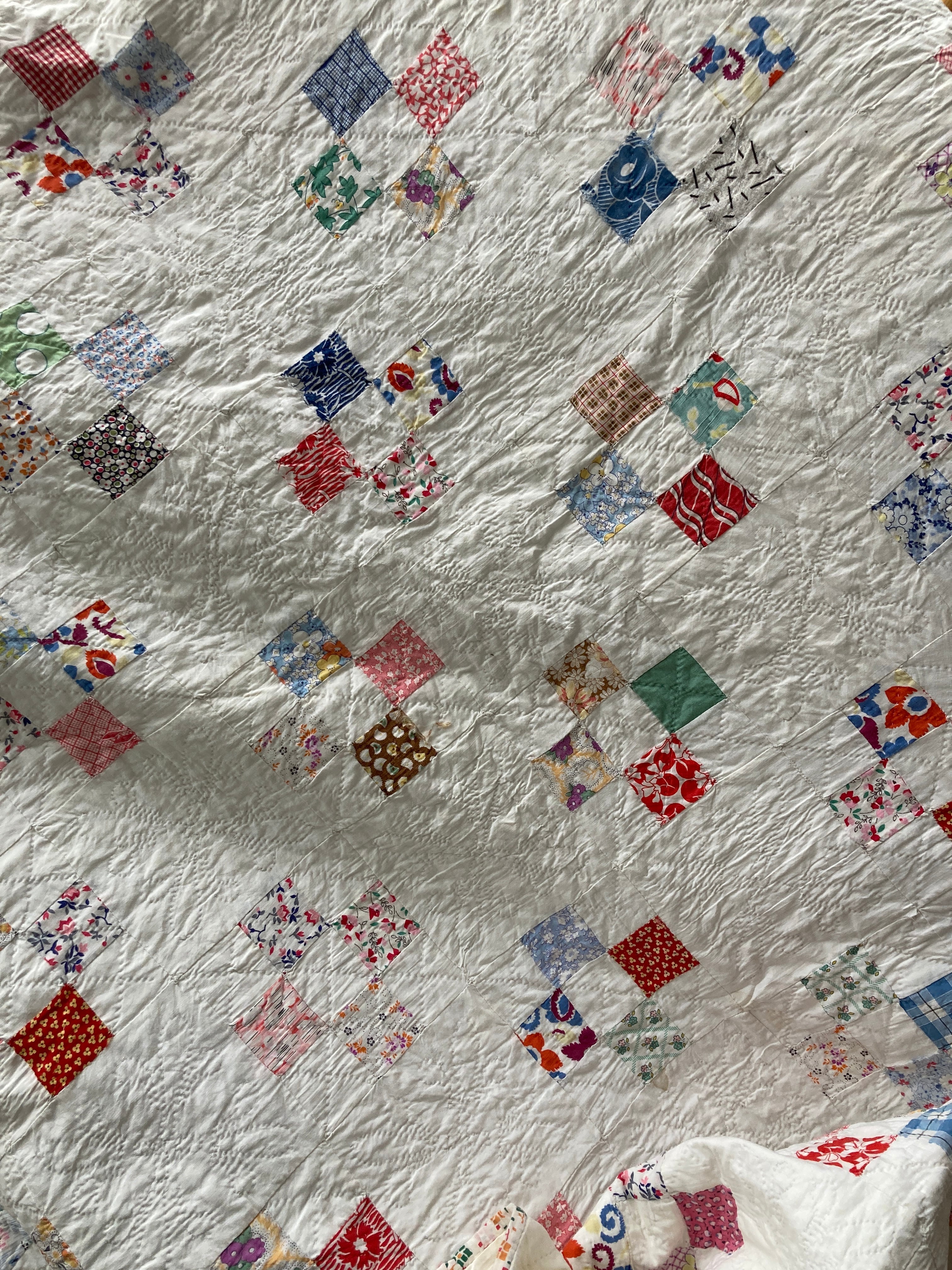 白い背景から浮かび上がる可愛らしさが魅力的な、ナインパッチキルトです。