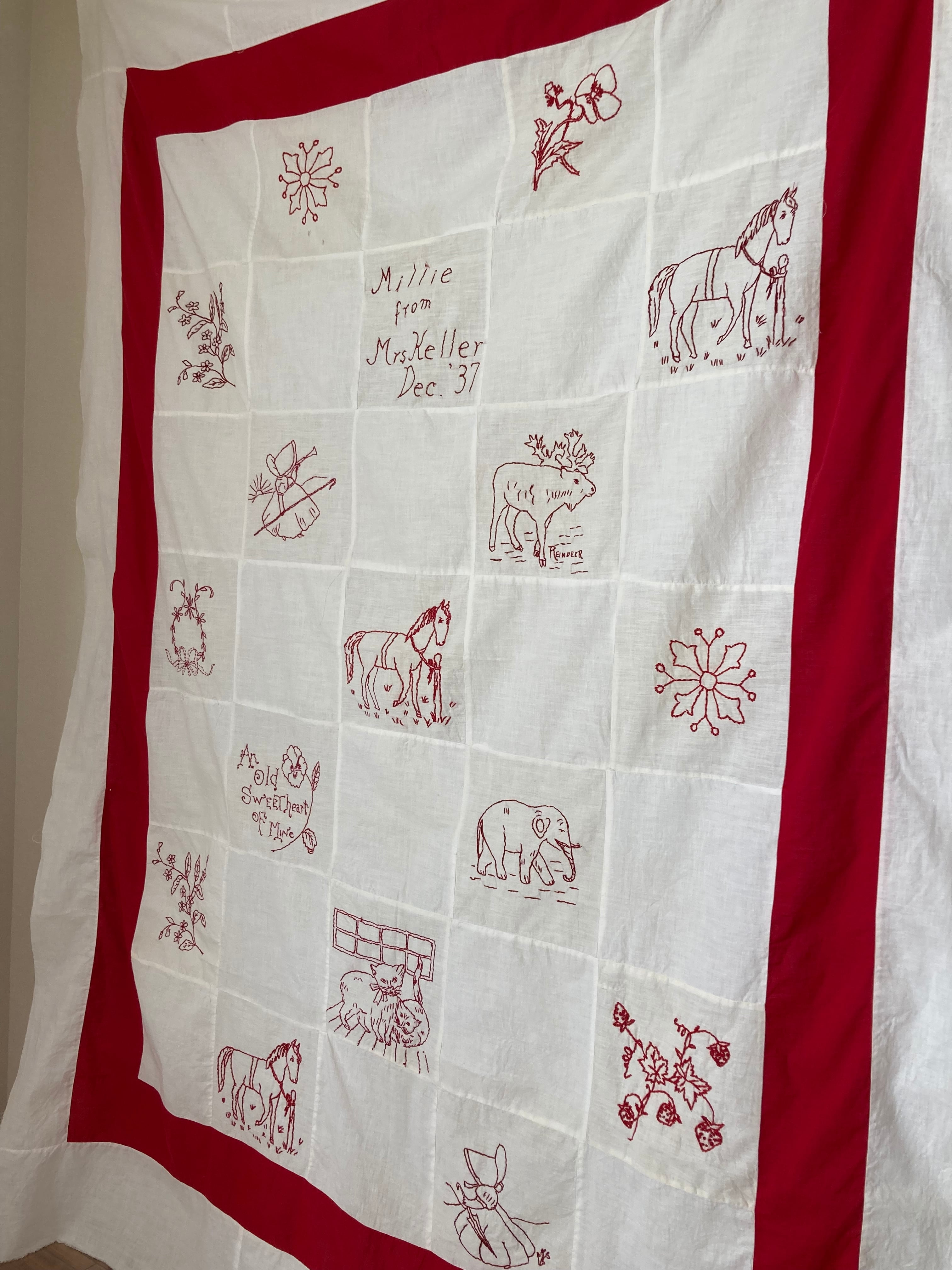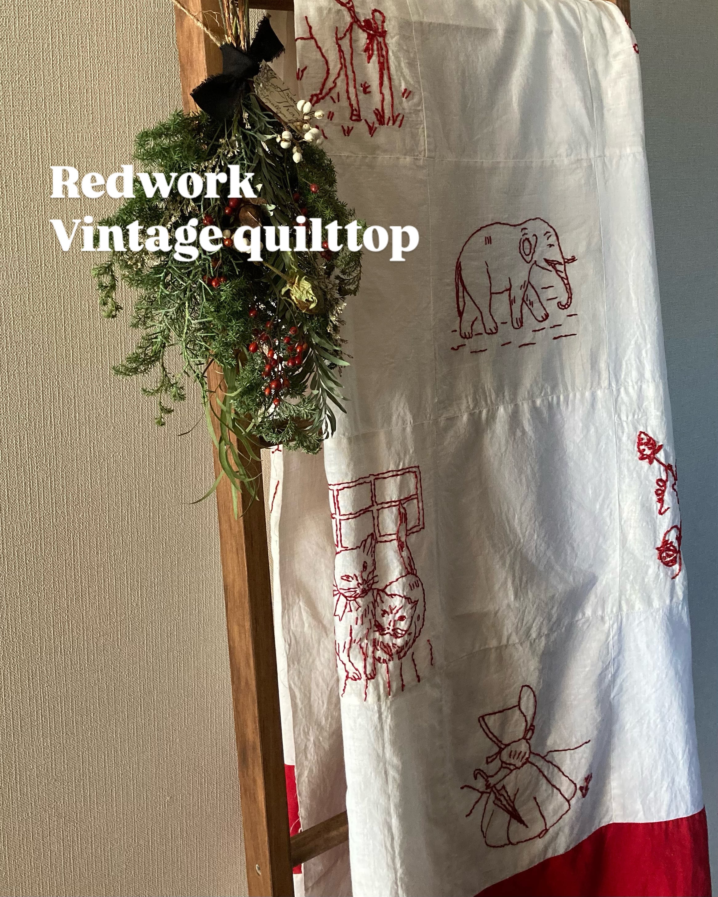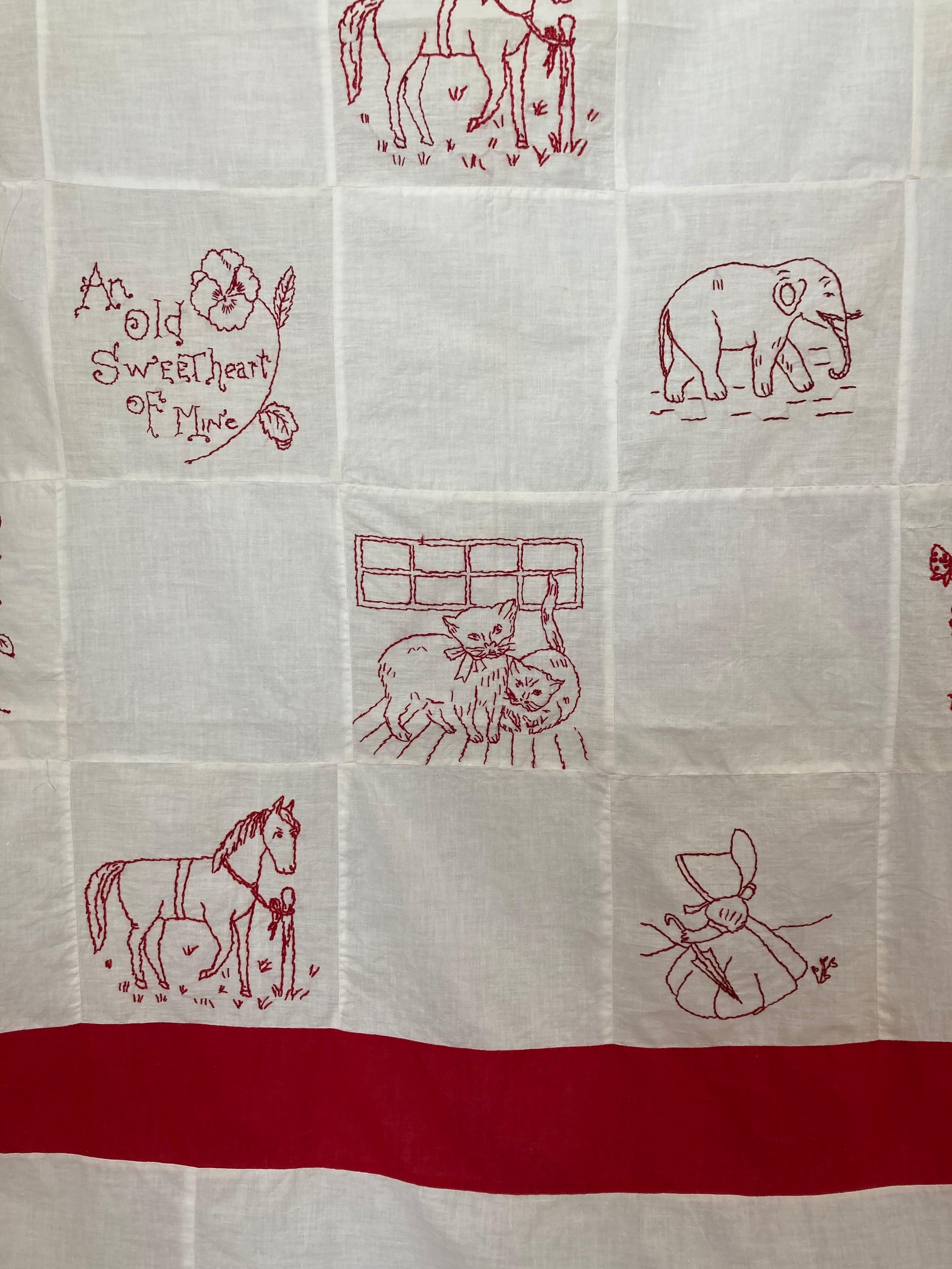 レッドワークの技法を用いたこちらのキルトトップ、個性的な動物やサンボンネットスーなどの手刺繍が独特の風合いを醸し出しています。