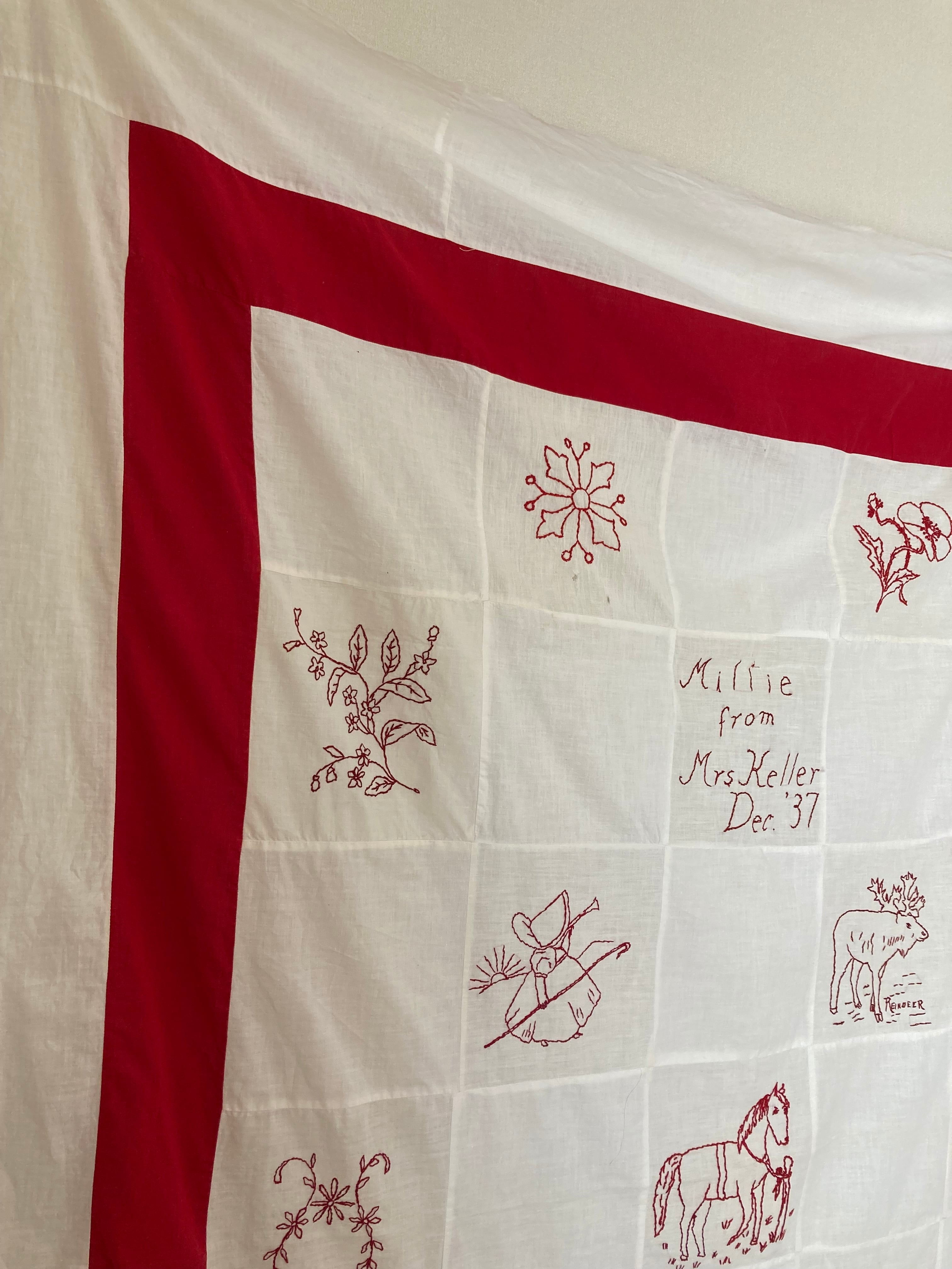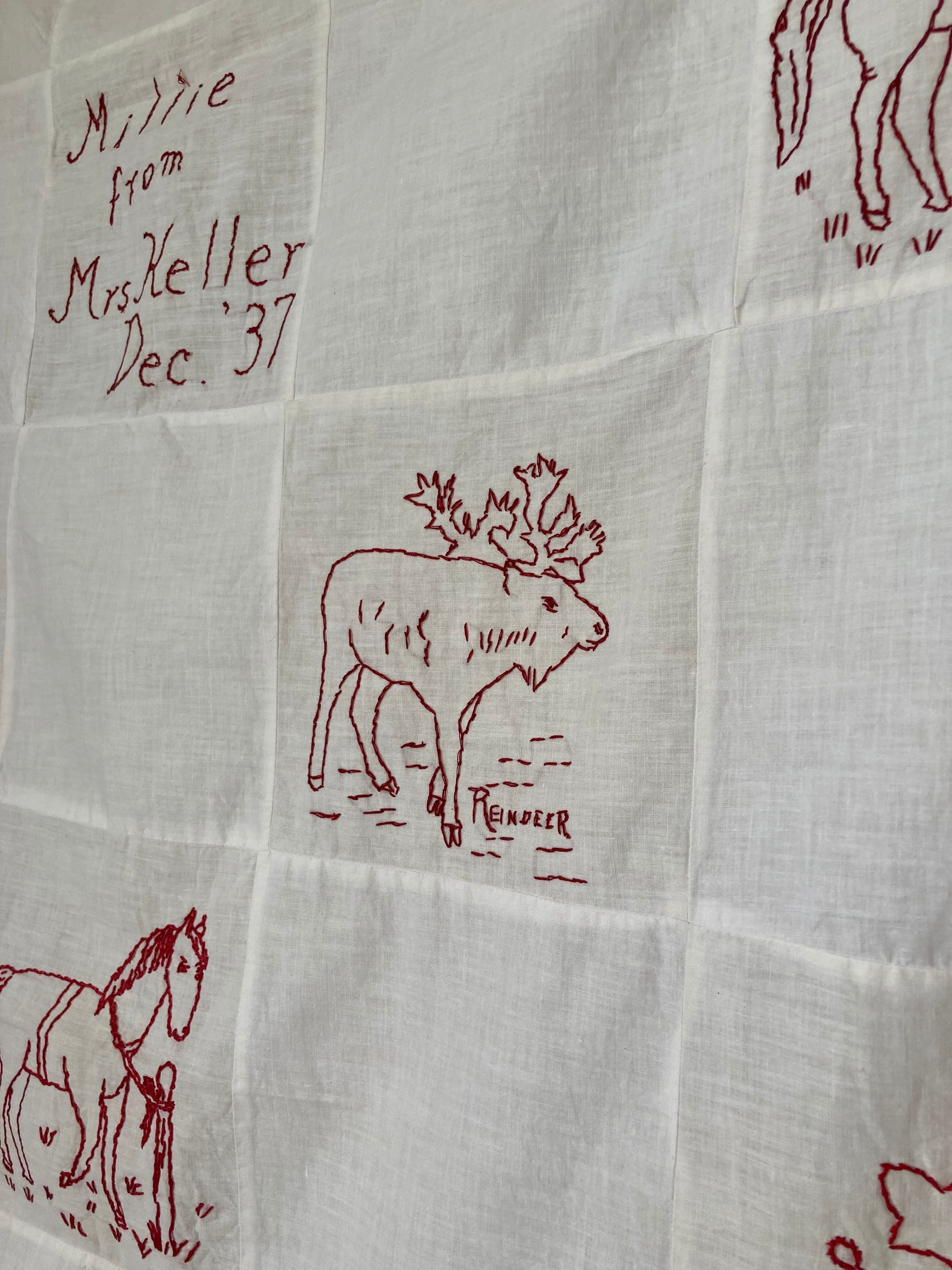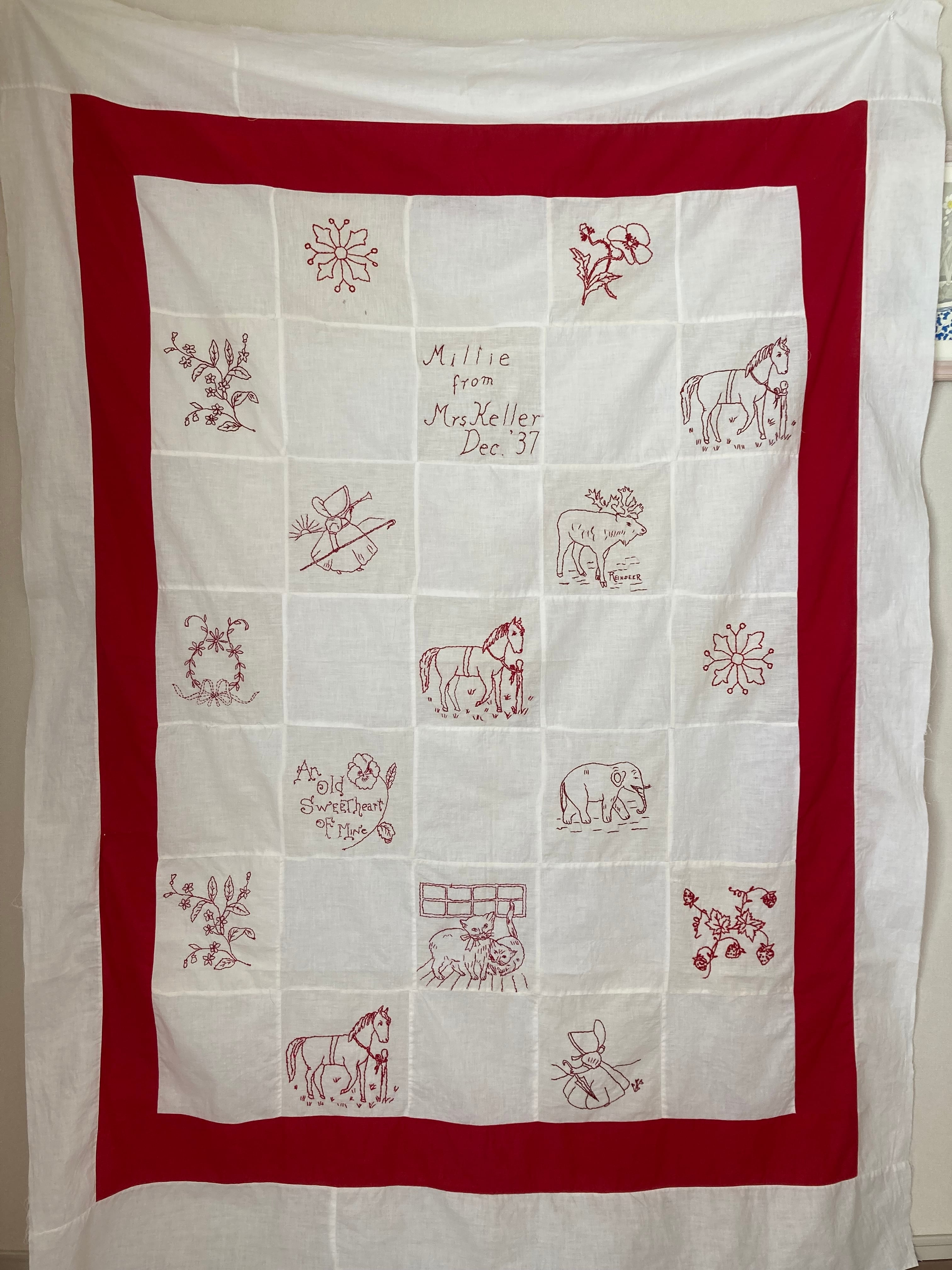 レッドワークの技法を用いたこちらのキルトトップ、個性的な動物やサンボンネットスーなどの手刺繍が独特の風合いを醸し出しています。